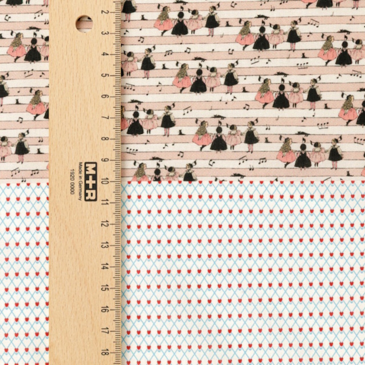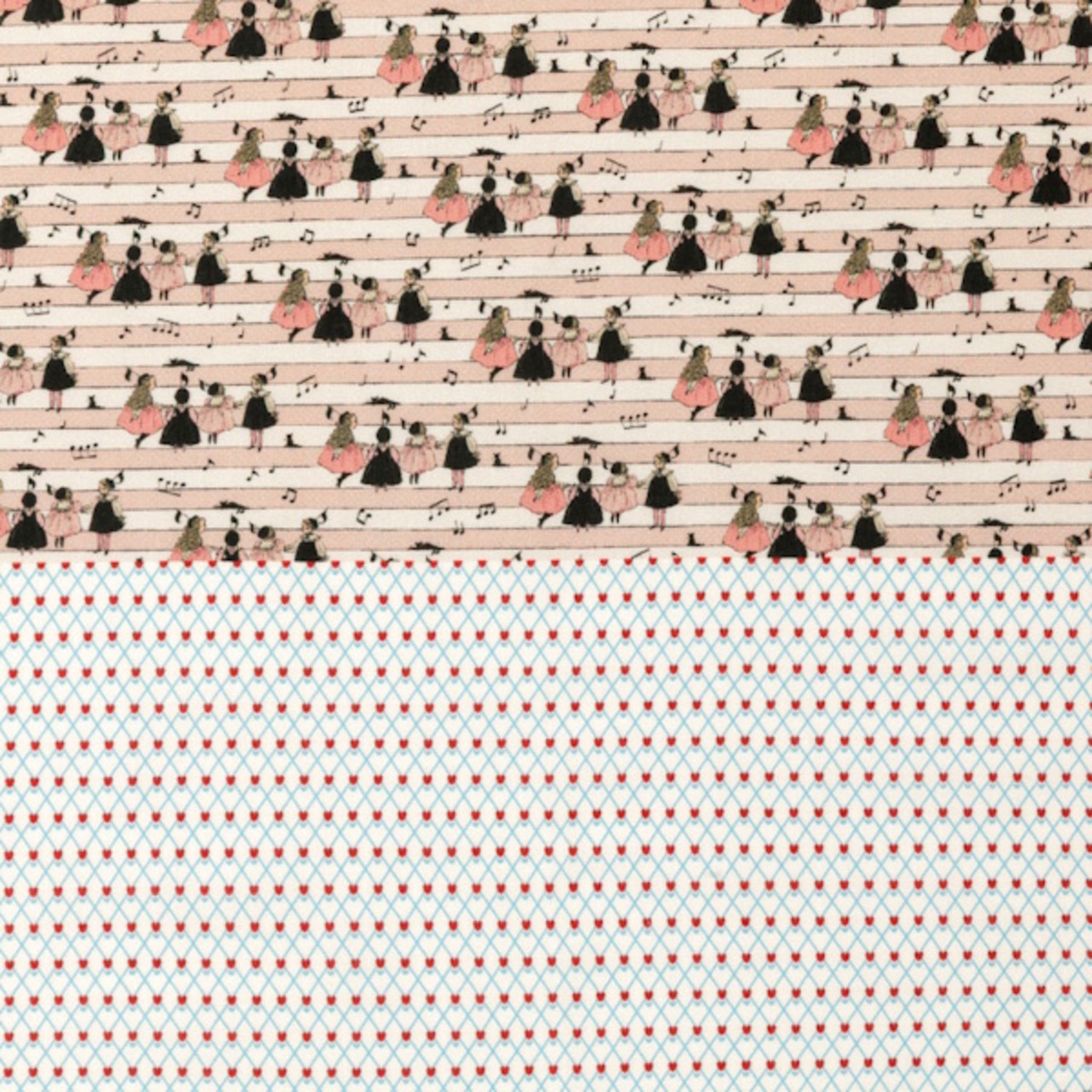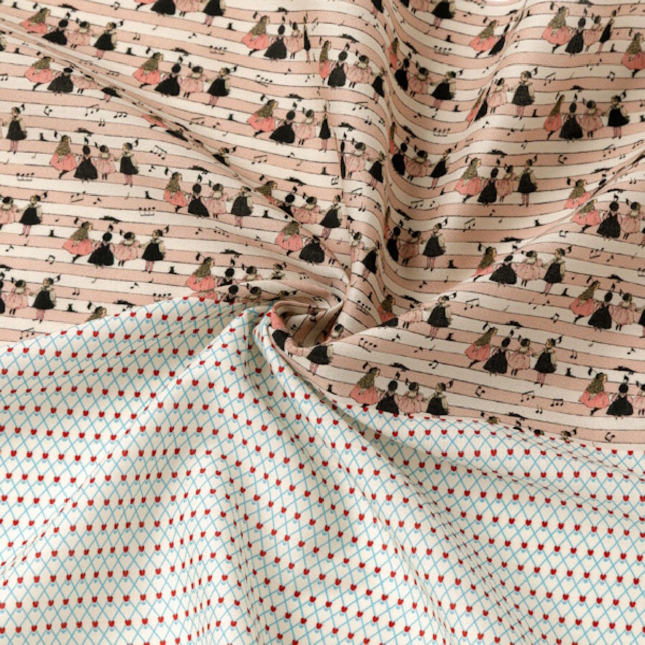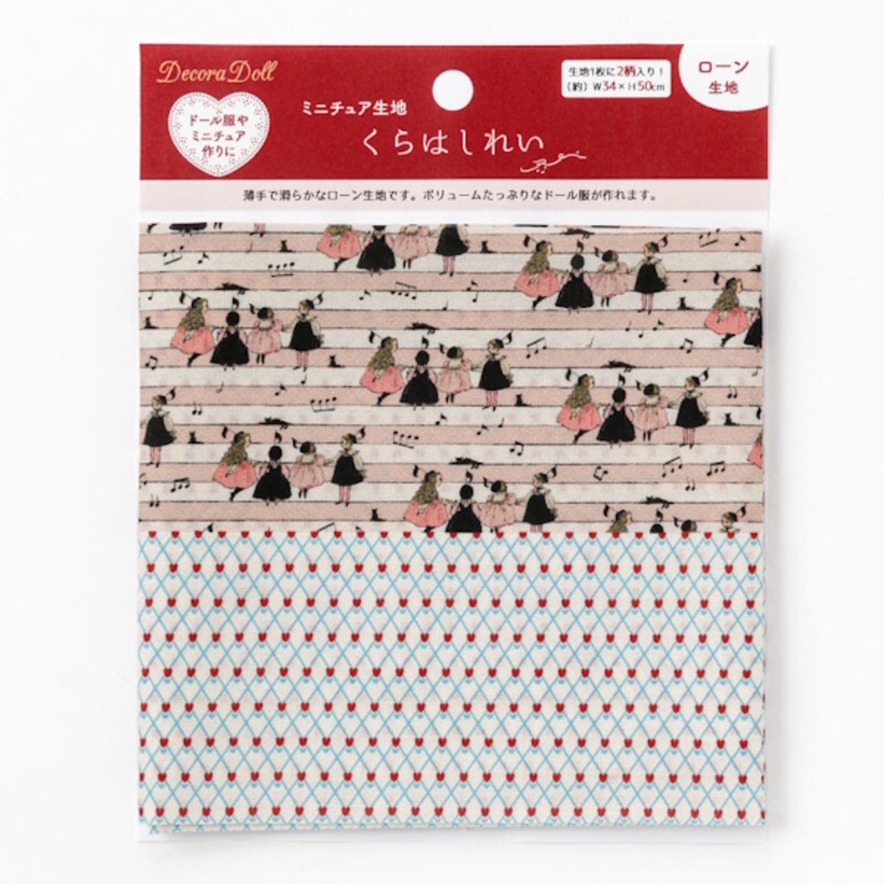 幅約34cm、長さ50cmの生地上に、通常サイズの生地の柄をミニチュアサイズに縮小した柄の生地とくらはしれいさんの描くお洋服の柄を再現した生地の2柄がプリントされています