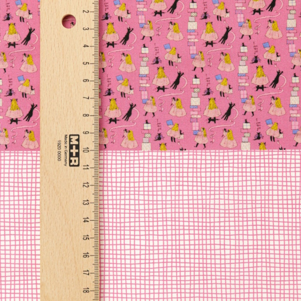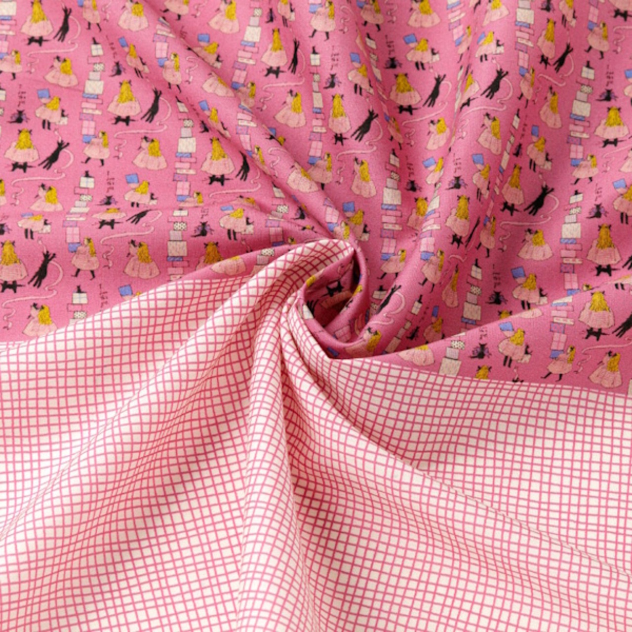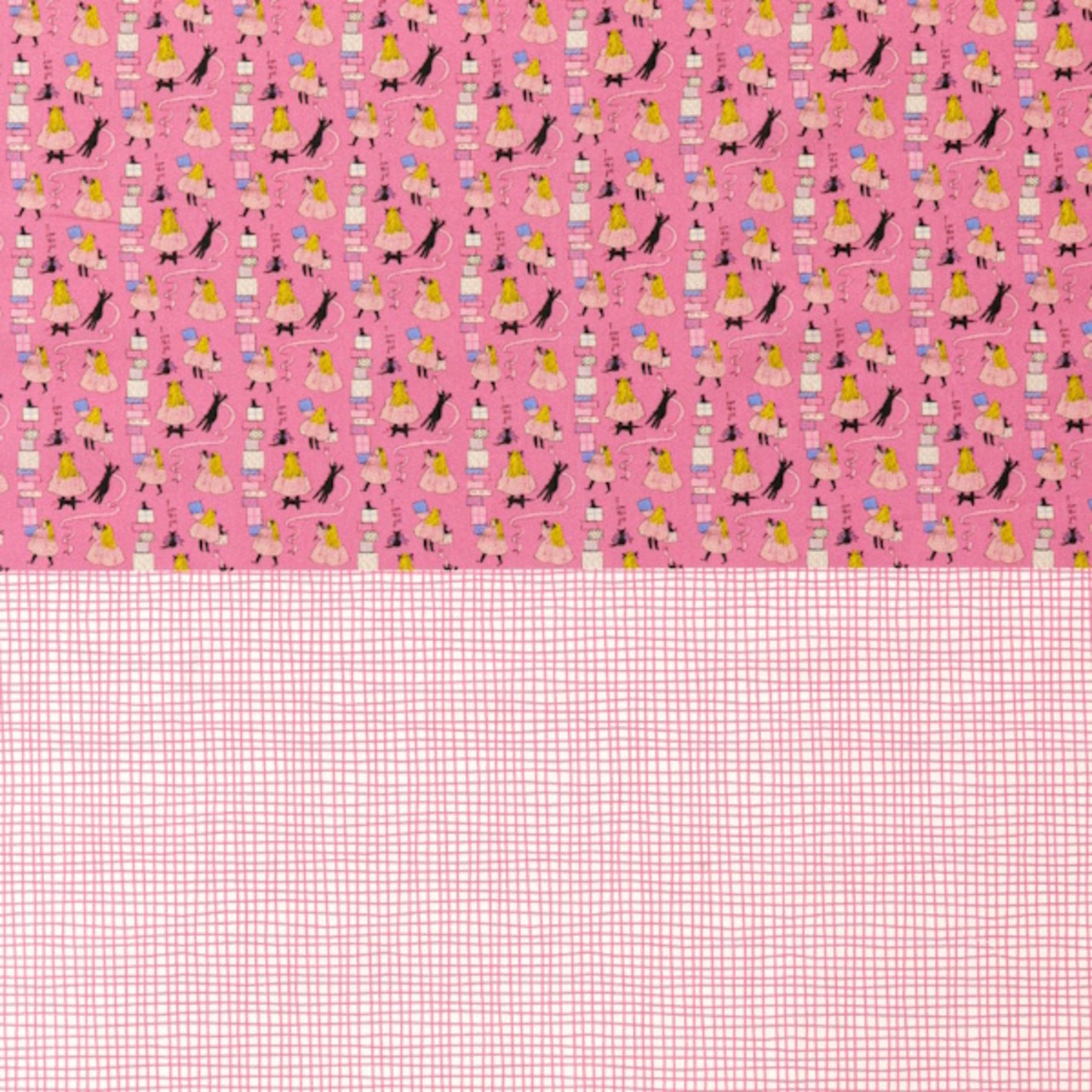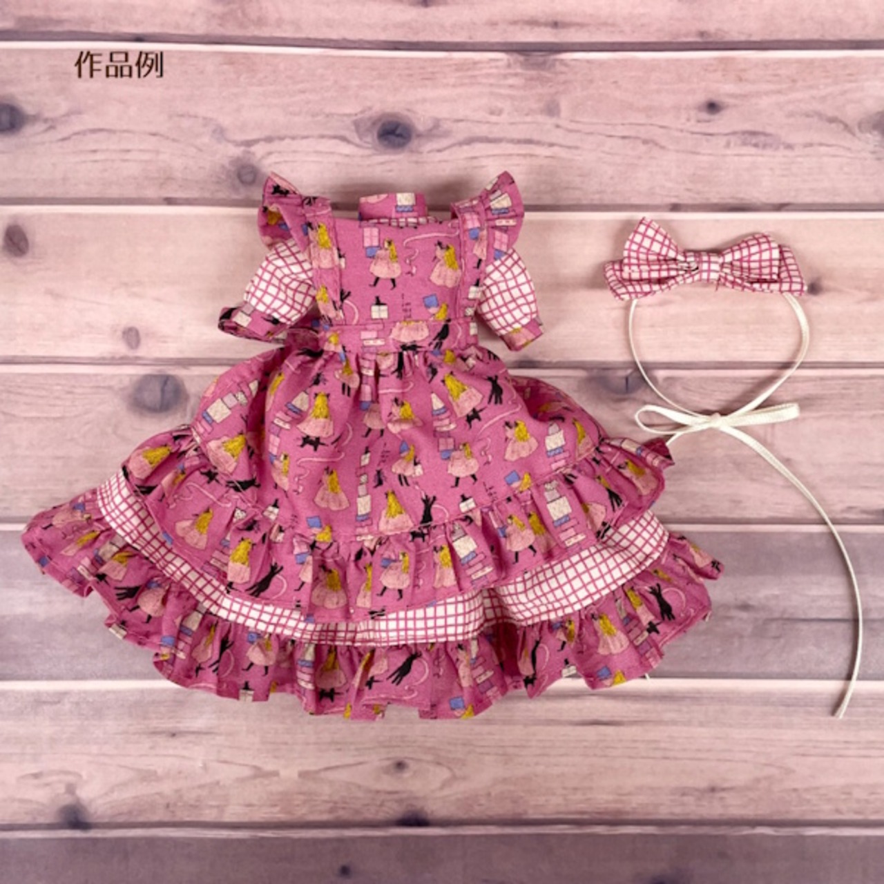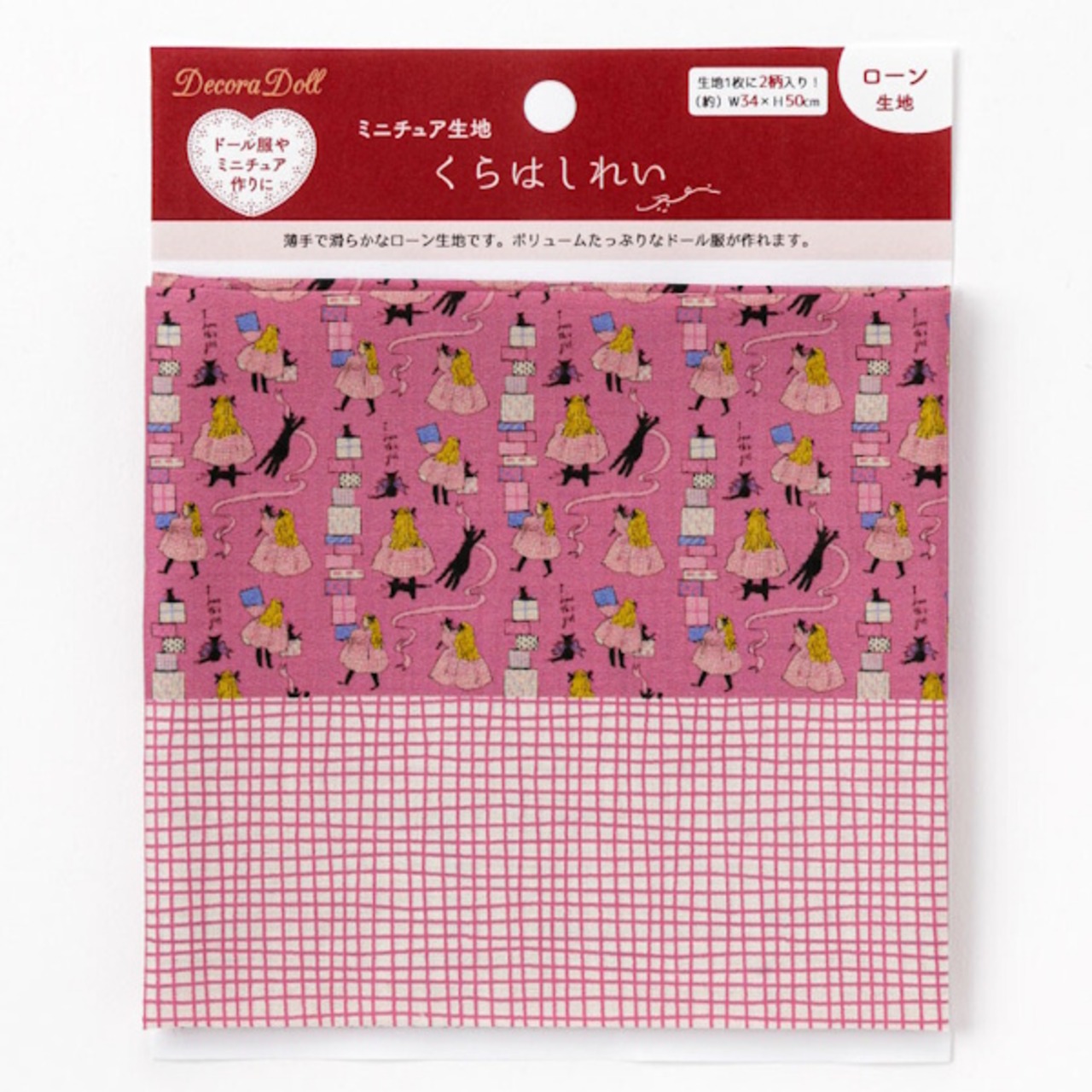 幅約34cm、長さ50cmの生地上に、通常サイズの生地の柄をミニチュアサイズに縮小した柄の生地とくらはしれいさんの描くお洋服の柄を再現した生地の2柄がプリントされています