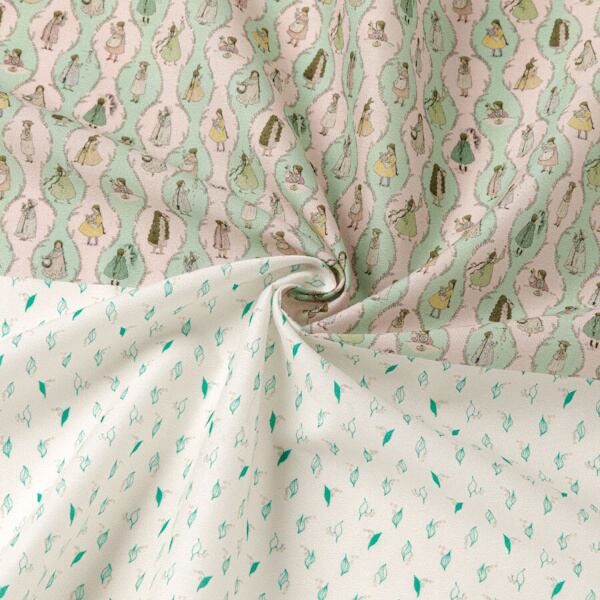幅約34cm、長さ50cmの生地上に、通常サイズの生地の柄をミニチュアサイズに縮小した柄の生地とくらはしれいさんの描くお洋服の柄を再現した生地の2柄がプリントされています