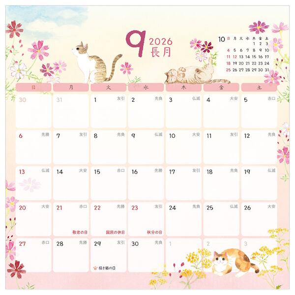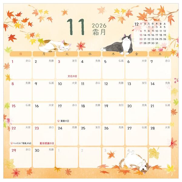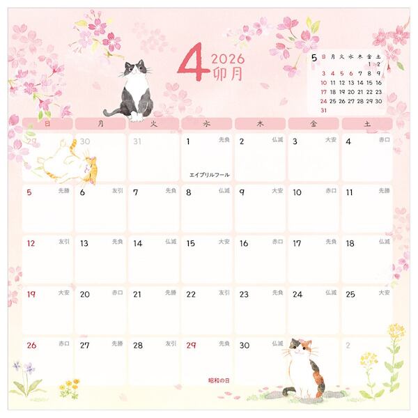 季節の花々や風物詩と可愛らしい仕草の猫たちが季節を彩る壁掛けカレンダーです