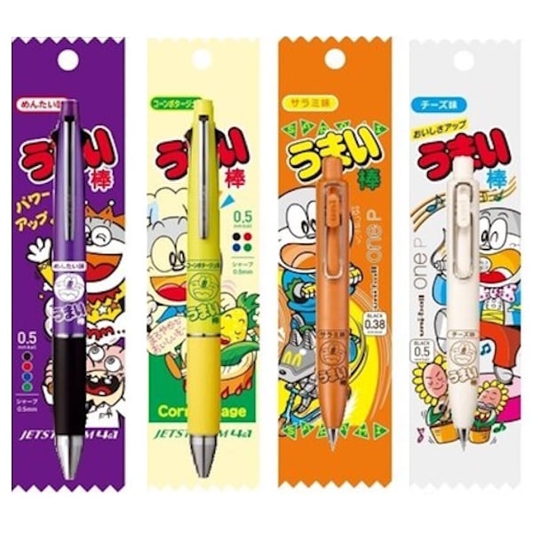 おなじみ「うまい棒」デザインのジェットストリーム4&1とユニボールワンPの4種類セットです