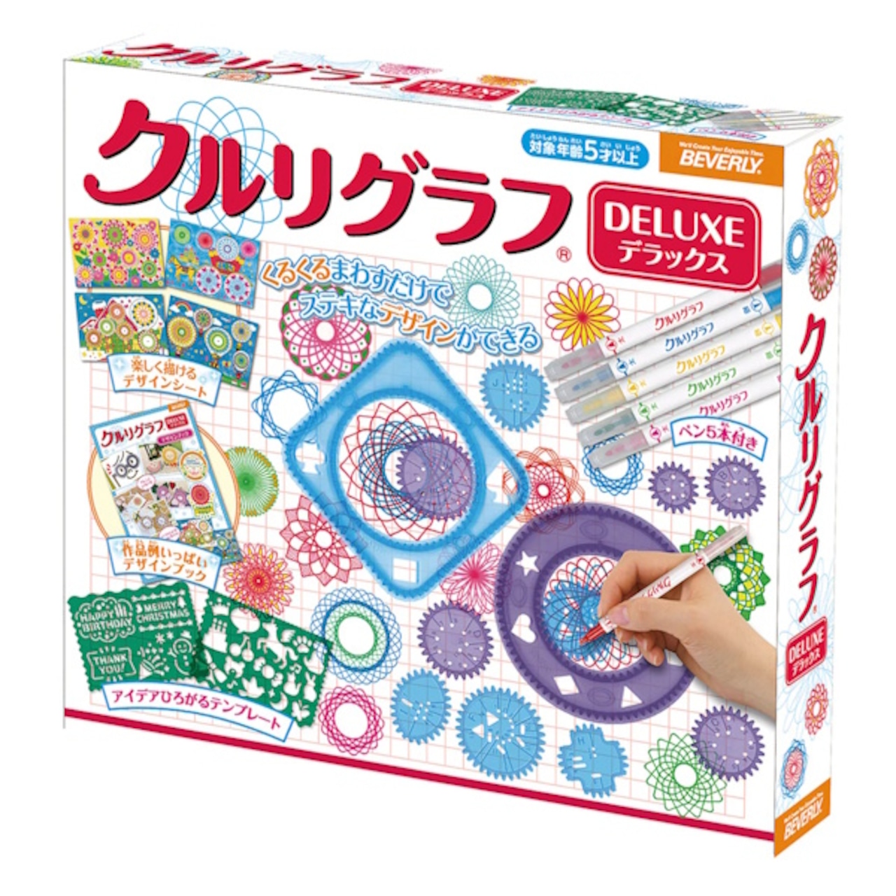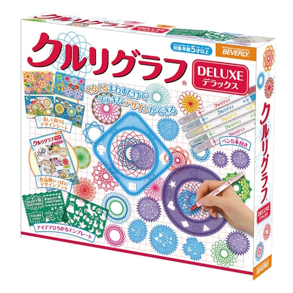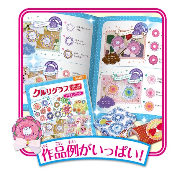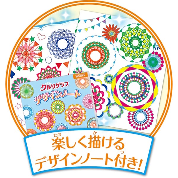 くるくるまわすだけで、ステキなデザインができちゃう セット内容 リング2個、ギア10個、ペン5本、デザインブック1冊、テンプレート2枚、デザインシート8枚、クルリグラフケース1個