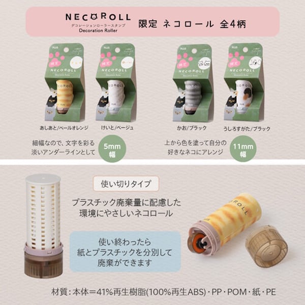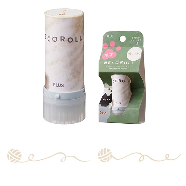 コロコロと転がすだけで、手帳や日記、ノート、カードなどを淡いカラーのインクで好みの長さに飾って楽しめるコンパクトなスティック形状のローラー式スタンプ「ネコロール」