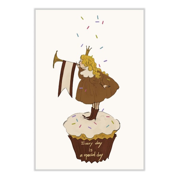 「甘いお菓子と女の子」をテーマにした、心が躍るような可愛らしいイラストのポストカードです